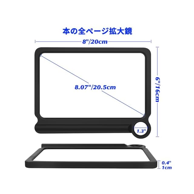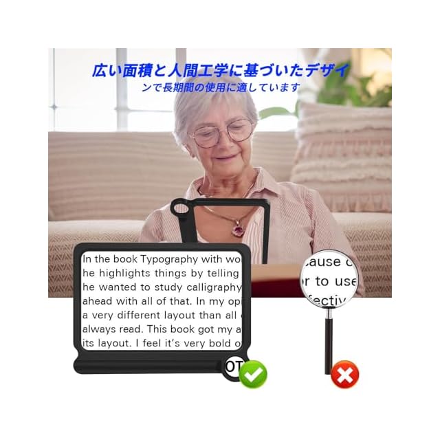 【広い表示領域】最大17.7cmx12.7cmの表示領域。大型拡大鏡は人の読書方法に合わせて特別に設計されており、何度も拡大鏡を移動することなく広い表示領域をカバーします。
