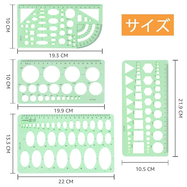 商品仕様:セット内容:図面テンプレート×4、収納袋×1 材質:プラスチック サイズ:最大:22×13.3cm 最小:19.3×10cm カラー:グリン(透明)
