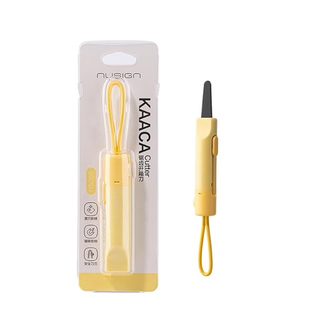 Nusign 【2025限定】ダンボールカッター(ギザ刃)安全設計 自動ロック機能 安全設計 手切れなし マグネット付き 携帯便利 軽量18g 専用開梱カッター ダンボール開封ツール 5色展開 業務用 家庭用対応 (イエロー)