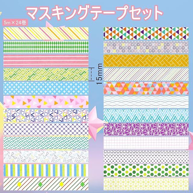 AUGSHYO マスキングテープ かわいい 24巻セット 5m巻き 和紙テープ 装飾テープ DIY用 プレゼント包装 15mm幅 (カラフル)