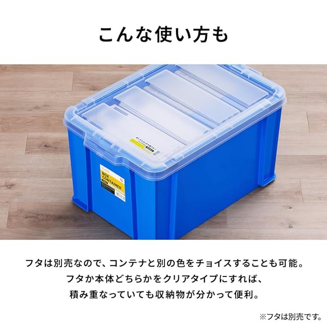 フタは別売なので、コンテナと別の色をチョイスすることも可能。フタか本体どちらかをクリアタイプにすれば、積み重なっていても収納物が分かり便利です。