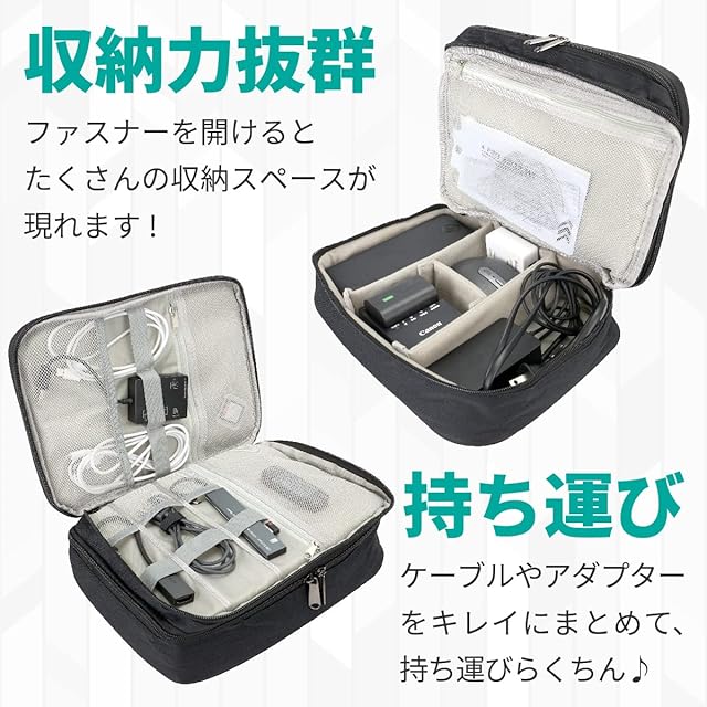 ケースの外側には持ち運びしやすいように、丈夫な作りの持ち手を完備。何が入っているかが分かりやすいシンプルなアイコンが印字されているため、多くのポーチやケースを持って移動することが多い方におすすめです。内側にはポケット付きケーブル収納・ゴムバンドケーブル収納・メッシュポケットの他に、更に大きなACアダプターやモバイルバッテリーなどの機材を収納できるスペースがあります。中の仕切りは用途に合わせて自由にレイアウトできるため、自分好みの使い方ができるところも魅力の1つです。