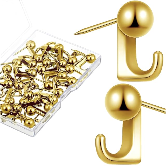 TOMAZON 25個入 画鋲 フック 押しピン 画びょう ピンフック 金属 錆びない 目立たない 耐荷重約5kg 石膏ボード ベニヤ板 DIY 小物掛け 時計 ポスター 絵画 額縁 鍵 写真 留め具 壁掛 固定用 クリスマス 装飾品釘 透明収納ケース付き (ゴールド)