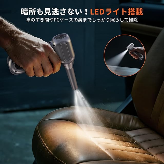 【LEDライト搭載&手のひらサイズで使いやすさ抜群】 高輝度LEDライトを内蔵しており、車内のすき間やPC内部など暗くて見えづらい場所でも、しっかり照らしながら清掃が可能。夜間の作業やアウトドアでも大活躍します。さらに、片手で持てるコンパクト&軽量ボディを採用。使いたいときにすぐ取り出せて、長時間の作業でも手が疲れにくい設計です。収納ポーチ付きで、ご自宅から車、職場、旅行先まで気軽に持ち運びOK。