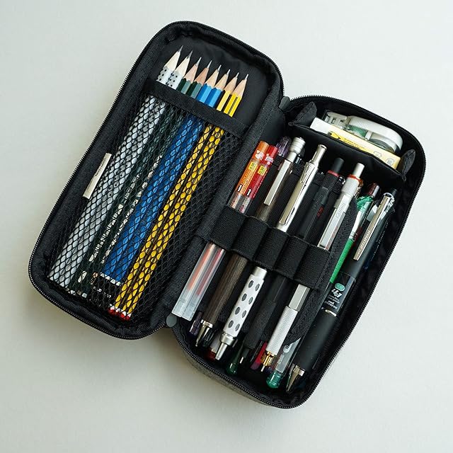 大容量ペンケース、メッシュポケット1箇所・消しゴム用仕切り・5本用ペンホルダー搭載で、筆記具と消しゴムを分けて収納可能、スムーズに取り出せる設計。