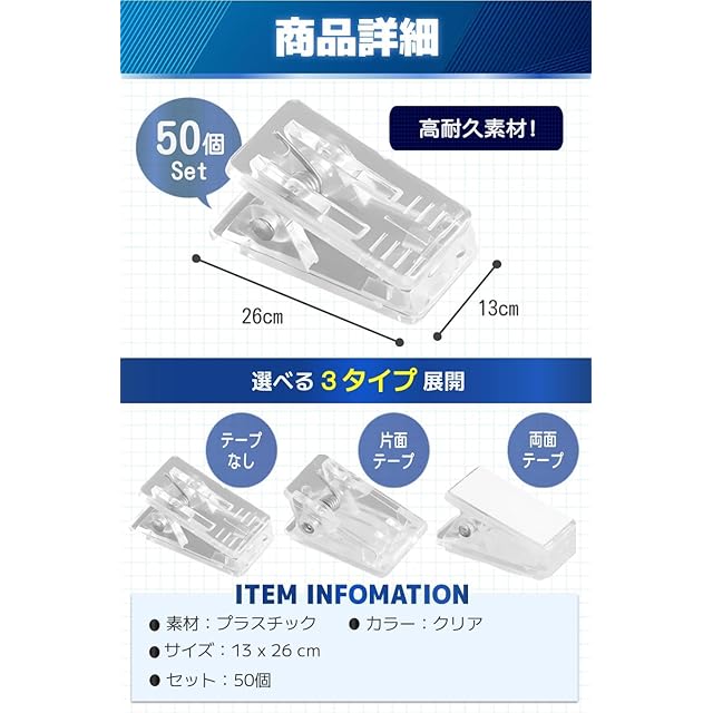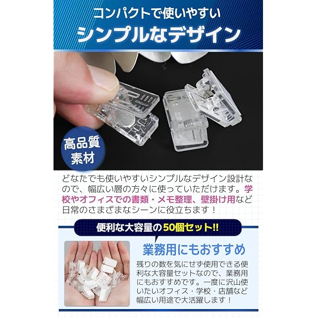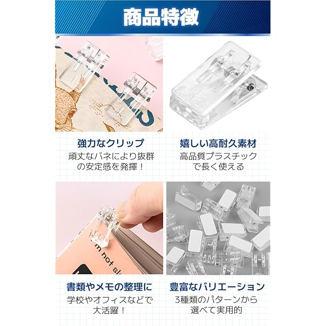 【商品特徴】①強力なクリップ:頑丈なバネにより抜群の安定感を発揮!/②嬉しい高耐久素材:高品質プラスチックで長く使える/③書類やメモの整理に:学校やオフィスなどで大活躍!/④豊富なバリエーション:3種類のパターンから選べて実用的
