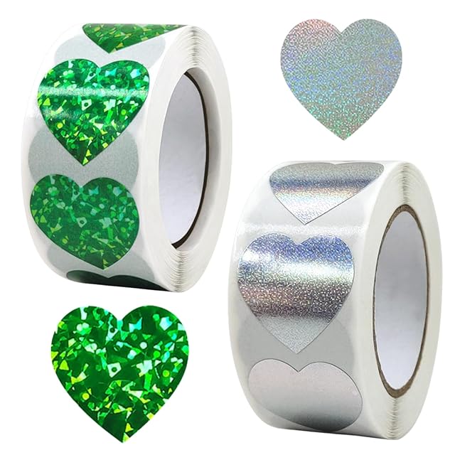 キラキラ ごほうびシール ハート グリーン+シルバー 500枚×2個セット 1000枚 ロールシール かわいい デコレーション ギフト用 NYANDELMO ND-0209-R06-heart-GN+SV
