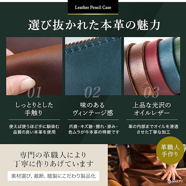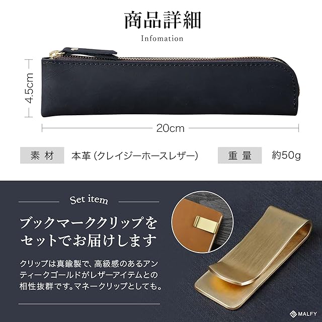 【商品詳細】〇サイズ:20cm×4.5cm 〇重量:約43g 〇素材:牛本革(クレイジーホースレザー)〇セット内容:ペンケース、真鍮製ブックマーククリップ 〇ブランド:MALFY ※国内自社検品