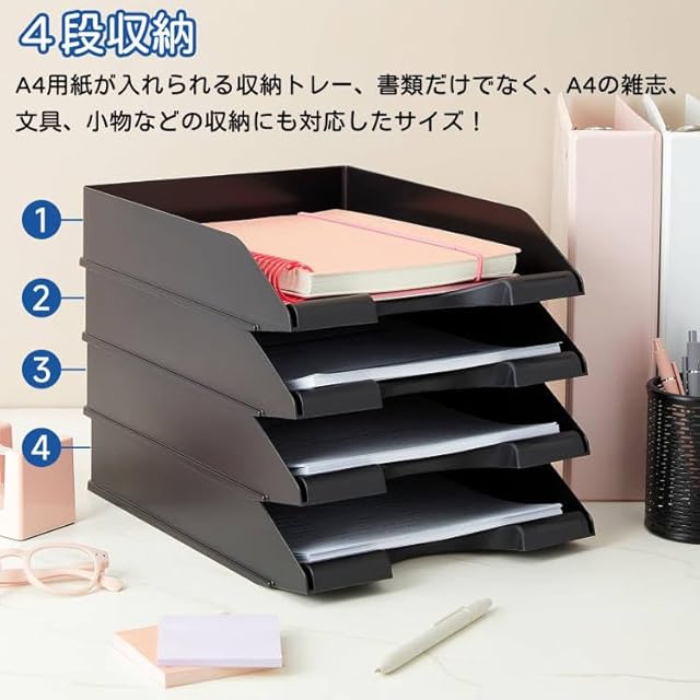 【多機能な書類トレー】サイズ:34㎝x25.5㎝x6.5㎝、4個セット、この4段の黒いレターケース使用すると、A4サイズのファイルを保管でき、重要書類、文書、請求書、領収書、雑誌、ノート、新聞、辞書、A4コピー用紙、手紙、メモをデスクの上に整然と置き、カテゴリ別に分類して保管することもできます。机の上がすっきり片付くと仕事や勉強仕事の効率があがると繋がります!横長口のタイプになっているので取り出しも収納も楽々です。
