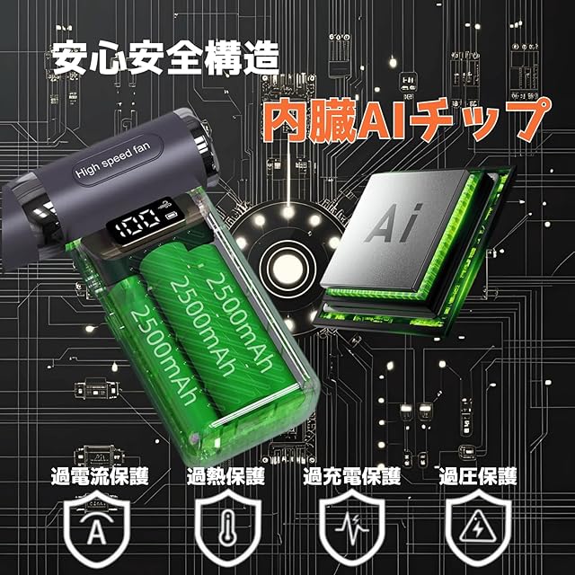 【7500mAh大容量 & 安全対策済み】3倍のバッテリー容量で長時間駆動(最大約120分)。従来の2000mAhモデルを大きく上回る持続力。過充電防止、過熱保護などの安全機能を備え、大容量でも安心してお使いいただけます。