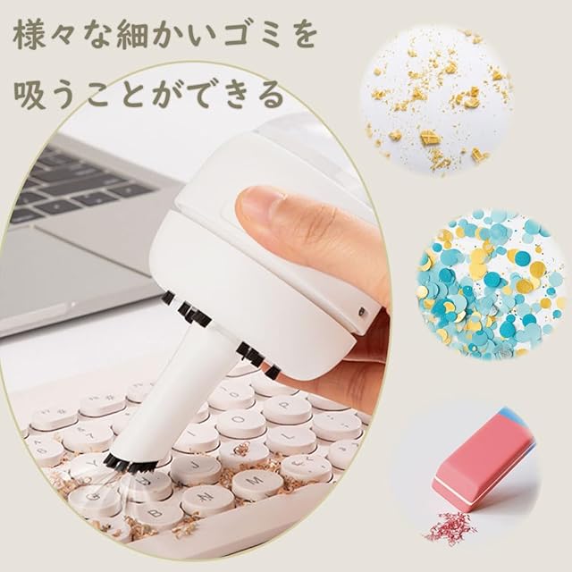 卓上クリーナー 消しカスクリーナー 充電式 キーボード掃除機 強力吸引 360°上昇風 リンゴのような重さ 消しカス取り ミニクリーナー 簡単操作 細かいゴミ コンパクト プレゼント (白(充電式))