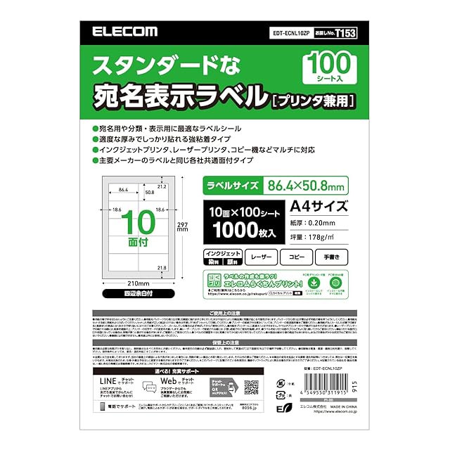 エレコム ラベルシール 表示・宛名ラベル 10面 W86.4×H50.8mm 四辺余白付 100シート プリンタ兼用 マット紙 EDT-ECNL10ZP