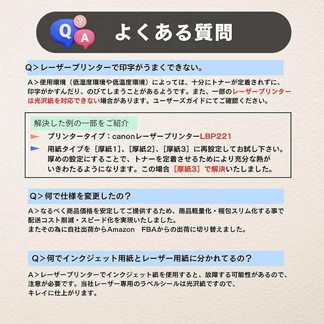 ご使用方法 1.プリンタ機種により用紙設定や給紙トレイが異なります。ご使用の機器の取扱説明書をご確認ください。 2.プリンタにセットする前に、用紙をよくさばいてください。 3.複数枚の用紙をセットして正常に給紙されない場合は、1枚ずつセットしてください。