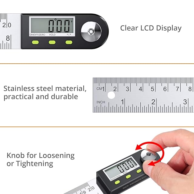 【簡単で正確な測定】読みやすいデジタルLCDディスプレイ、精度±0.3°、分解能0.05°、相対角度と絶対角度の測定が可能で、ゼロリセット機能とデータホールド機能が備えています。
