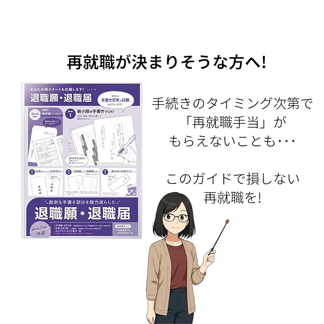 <p><strong>【こんな方におすすめ】</strong></p> <ul> <li>✔ 退職届と履歴書をすぐに準備したい</li> <li>✔ 失業手当や再就職手当の申請方法を知りたい</li> <li>✔ 転職活動をスムーズに進めたい</li> <li>✔ 手当の条件や注意点を事前に把握したい</li> </ul> <p><strong>【セット内容】</strong><br> 退職届・履歴書・提出用封筒・A4カラー申請ガイドを同封。<br> ガイドには、失業手当や再就職手当の申請方法、もらえなくなるケースなど重要ポイントをわかりやすく解説しています。</p> <p><strong>【特徴】</strong></p> <ul> <li>✔ 正式書式の退職届と履歴書で安心提出</li> <li>✔ 封筒付きでそのまま送付可能</li> <li>✔ 初めての退職・転職でも迷わず手続き</li> </ul> <p>転職活動と給付金申請の両方をサポートする実用セット。<br> 「早く転職したら手当がもらえなかった」という失敗を防ぎます。</p>