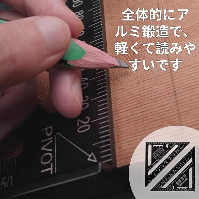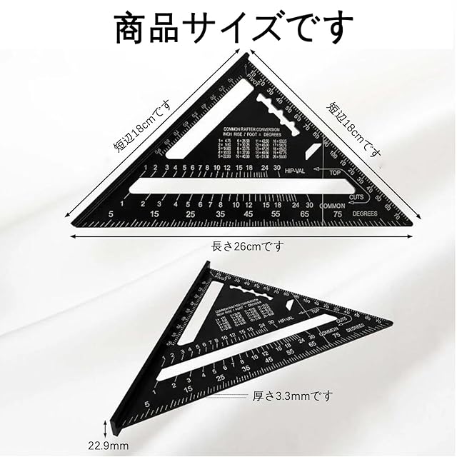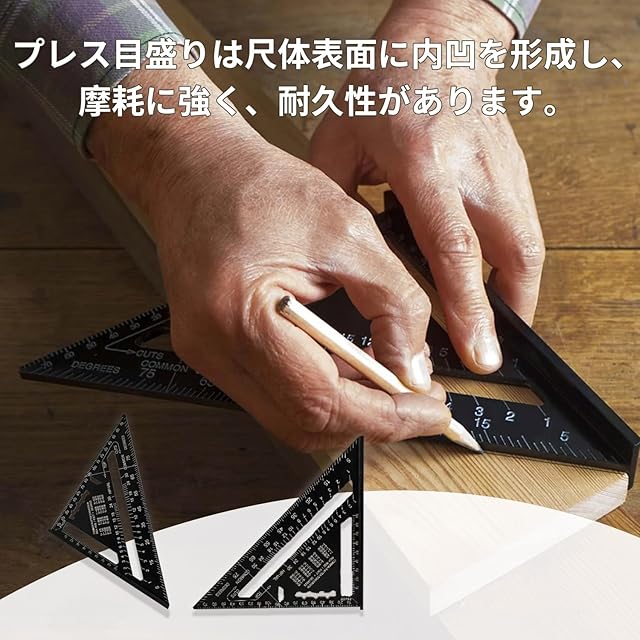 三角定規 サイズ:18.5*18.5cm;厚み:4mm。木工 丸鋸定規ユニークなデザイン、木工職人の基本的な測定ツールとして使用できるよう独自に設計されています。三角定規の前面にあるクイックチェンジテーブルは、角度を測ったり、木枠の方向に印をつけたり、平行線を引いたりするのに使える。