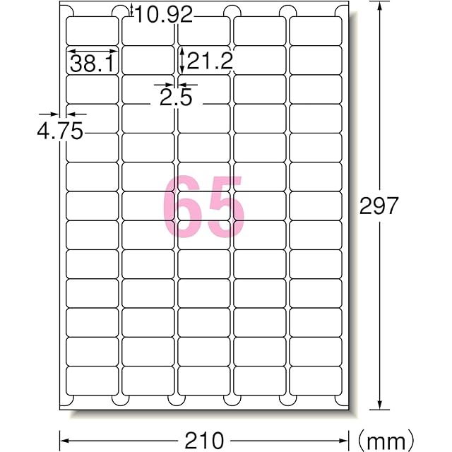 【製品情報】シートサイズ: A4判 (210mm×297mm) / 色: ホワイト / 質感: マット紙 / ラベルサイズ: 38.1×21.2mm (5列×13段) 65面 / 入り数: 100シート(6500枚分) / ラベル厚み: 0.09mm