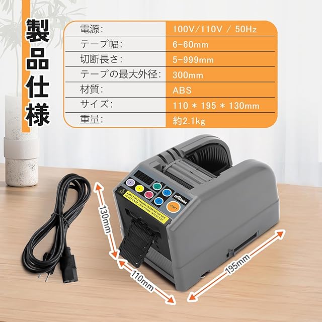 <b>「サイズ」<br> 140x115x200mm <br> <b>「材質」<br> ABSプラスチック<br> <b>「電源」<br> 100V/110V / 50Hz<br> <b>「テープ適用幅」<br> 6-60mm<br> <b>「切断長さ」<br> 5-999mm<br> <b>「テープの最大外径」<br> 1300mm<br> <b>「重量」<br> 約2.2kg<br> <b>「付属品」<br> 本体x1、電源ケーブルx1、日本語取扱説明書x1<br>