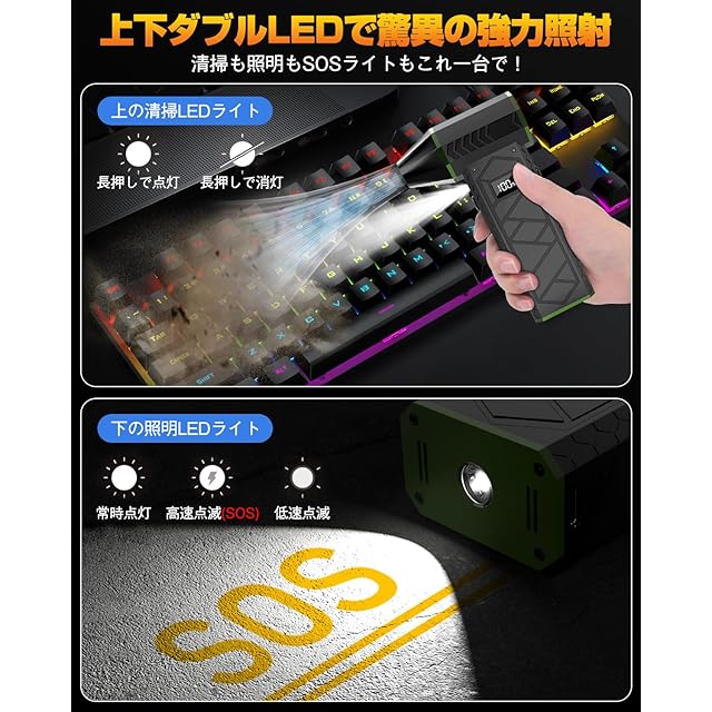 【ダブルLEDで強力照射!清掃も照明もSOSライトもこれ一台】✅✅■清掃から照明、手持ちライト・懐中電灯・防災ライトまで、まさに「これ1台で完璧!」の電動エアダスター登場!✅✅①上下に搭載したダブルLEDが驚異の明るさを放ち、通常のエアダスターとは一線を画す光量で、暗い隅々も小さな隙間もまるで昼間のように照らし出し、清掃の手間を一気に解消!✅✅②さらに、この多機能ライトは、手持ちライト・懐中電灯・防災用・キャンプ用ライトとしても使用可能。停電や緊急時にはもちろん、アウトドアでも大活躍。✅✅③その上、LEDの切り替えも超簡単。■上のLEDライトはライトボタンを長押しで点灯・消灯。■下のLEDライトはライトボタンを短押しで常灯・高速点滅(SOS)・低速点滅・消灯。