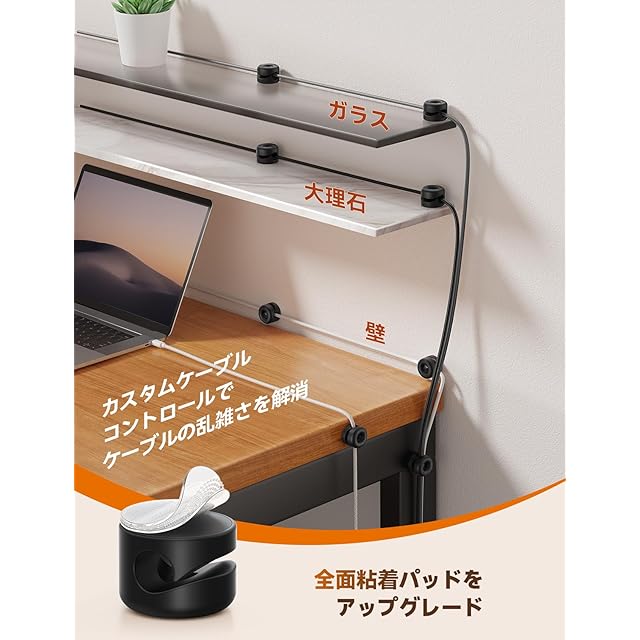 ✨【強力なアクリルパッド·残留性ない!】ケーブルクリップが強化されたアクリル粘着テープを採用して、木製やガラス製、プラスチック製や大理石などの色々な材質の平らできれいな表面にしっかりと貼り付けることができます。さらに、取り外し可能なアクリル粘着パッドはデスクトップや壁を傷つけず、剥がした後も残留物を残しません。 ケーブルホルダーを再利用できる交換用粘着テープもパッケージに含まれています。