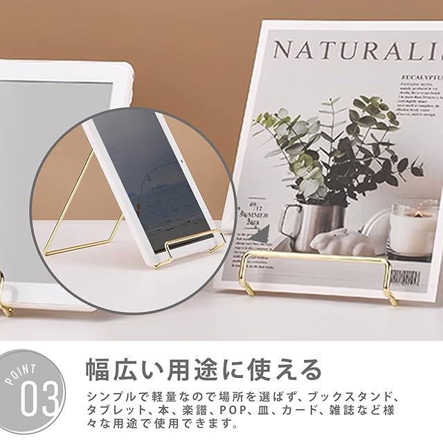 【幅広い用途に使える】シンプルで軽量なので場所を選ばず、ブックスタンド、タブレット、本、楽譜、POP、皿、カード、雑誌など様々な用途で使用できます。