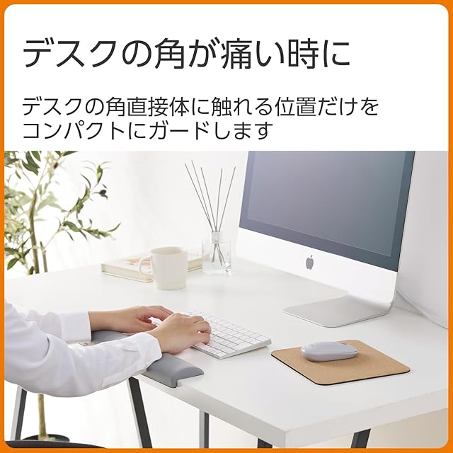コーナーガードクッションがデスクの角をしっかり覆い、手首や腕が角に当たらない設計です。