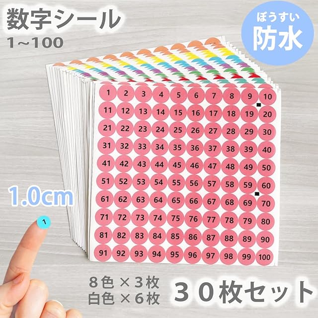 【商品説明】1~100のナンバーラベルシールです。9色とカラーバリエーションも豊富!8色3枚ずつ白が6枚の30枚入り。サイズは使いやすい1.0㎝サイズ。防水タイプなのでイベントで屋外で使用する際にも使えます。
