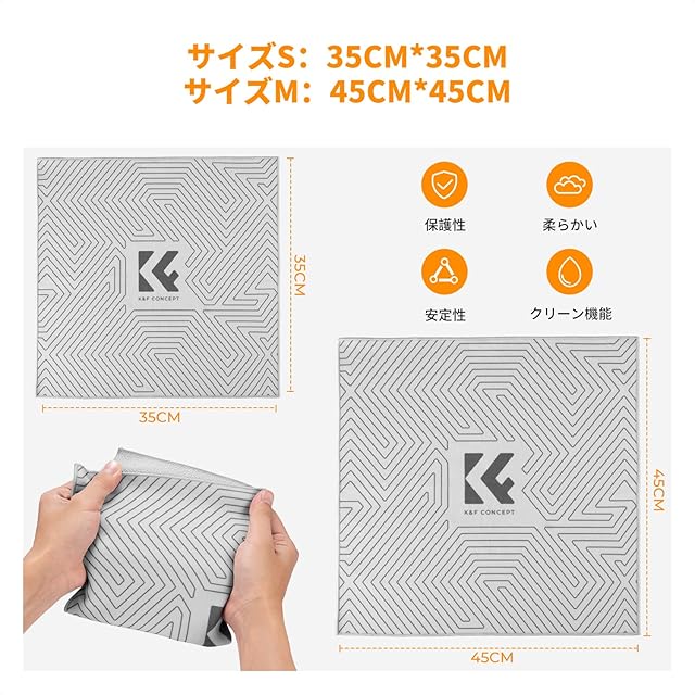 「商品仕様」サイズ:35x35cm、45x45cm 2枚セット、材質:ポリエステル100%、重量:53g+105g。2つのサイズがありますので、ご自由にお選択可能です。カメラ/レンズ/フラッシュ/PC/スイッチ/iPad/化粧品などの貴重な製品を自由に包んで保護します。