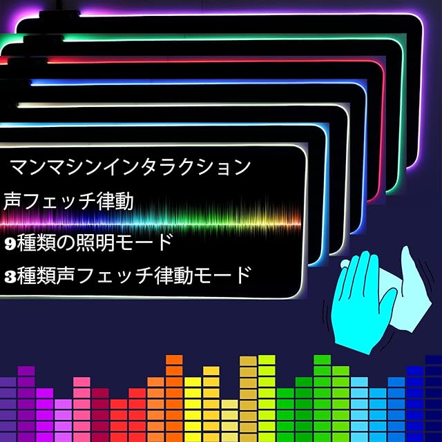 【人間と機械の連動】:拍手をしたり、テーブルを叩いたり、ゲームをしたり、音楽を聴いたりして音を出すと、発光バーは音の週波数に応じて異なる点滅を見せる(3種類の音声のリズムライトモード)。面白いインタラクティブ感、没入感を作り出す。また、9種類の非音声の多彩クールライトモードがあり、一定の雰囲気を醸し出している。