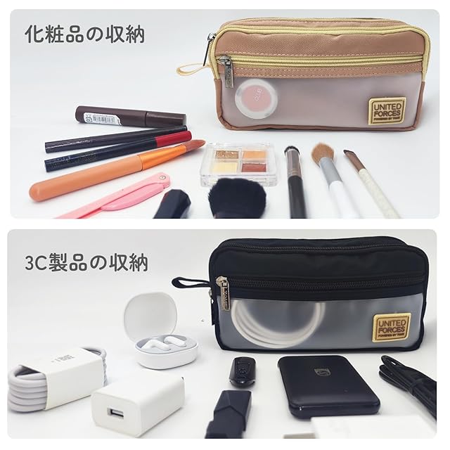 【機能的な3層仕切り】前面クリアポケットでICカードやメモをすぐ取り出せ,背面2層で文房具・化粧品・ガジェットをすっきり整理。