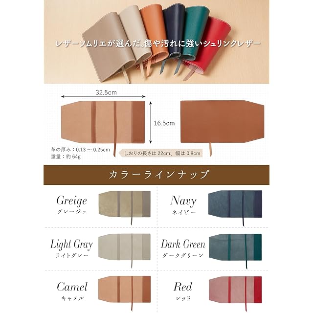 【商品サイズ詳細】横:32.5cm、縦:16.5cm、しおりの長さ:22cm(幅は0.8cm)、革の厚み:0.13~0.25cm、重量:約64g ※新型ハヤカワ文庫(トールサイズ:15.6×10.5cm)は入りません。※新書サイズ(17.3×11.0cm)は入りません。※出版時期によってサイズが異なる可能性もございますので実寸をご確認ください。