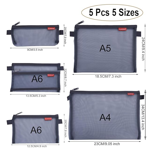 各種サイズ: ファスナー付きファイルバッグには5つのサイズがあります: ペンバッグ、A6、A6ダブルジッパー、A5、A4。学生が試験を受けるのに最適で、毎日の保管、またはオフィスワーカーが書類を保存できます。このメッシュバッグは、本、試験用紙、新聞、雑誌、化粧品なども収納できます。
