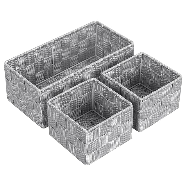 【3個セットで使いやすいサイズ構成】中型バスケット(約26.5×13.5×9cm)1個と小型バスケット(約13.5×13.5×9cm)2個がセットになり、引き出しや棚にぴったり収まるカゴ。