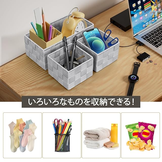 【4サイズを含める多用途の収納セット】特大型(31.8×30×11cm)1個、大型(30×28×9.9cm)1個、中型(28×12×10cm)2個、小型(12×10×8.9cm)4個がセットになり、衣類、小物、雑貨、文房具などの仕分け収納に最適なカゴ