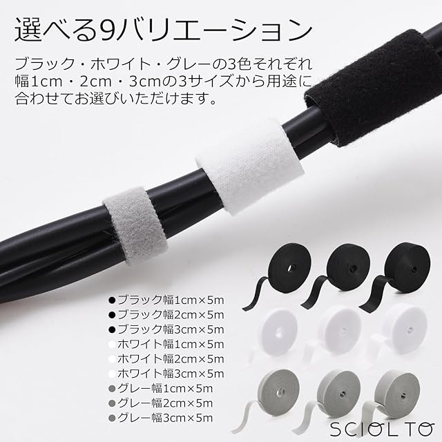 [SCIOLTO(ショルト)] マジックテープ バンド 面ファスナー [ロールの長さ5m] ケーブルバンド 配線整理 コード 束ねる 固定 (グレー, 幅1cm×長さ5m)