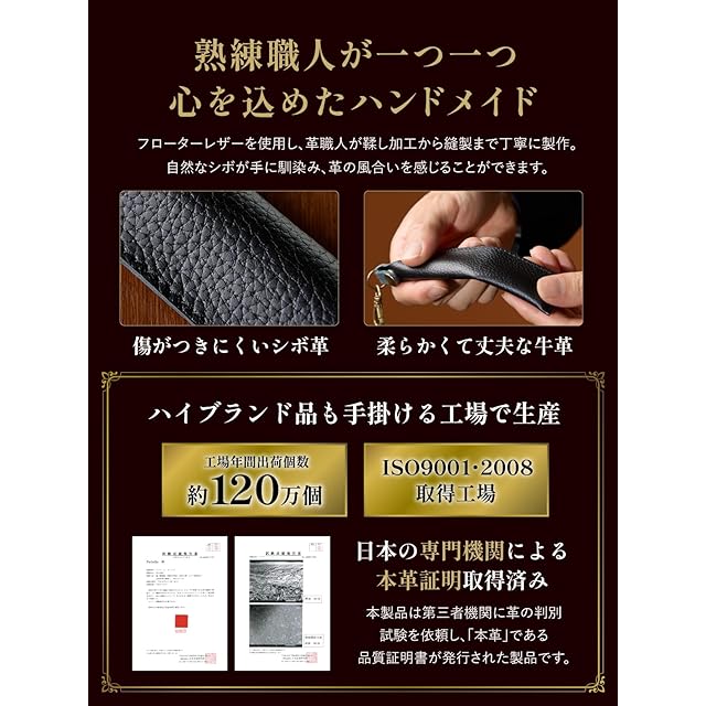 【熟練職人が一つ一つ心を込めて製作したハンドメイド品】ハイブランド品も手掛ける工場で生産。傷がつきにくいシボ革のフローターレザーを使用し、革職人が鞣し加工から縫製まで丁寧に製作。自然なシボが手に馴染み、革の風合いを感じることができます。柔らかくて丈夫な牛革で出来ていて長くご愛用いただけます。【日本の専門機関による本革証明取得済み】本製品は第三者機関に革の判別試験を依頼し、「本革」である品質証明書が発行された製品です。