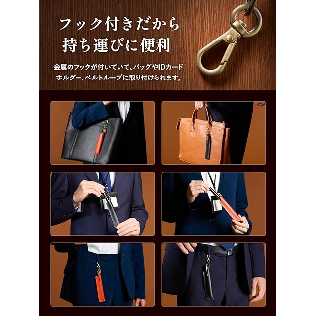 【フック付きだから持ち運びに便利】金属のフックが付いていて、バッグやIDカードホルダー、ベルトループに取り付けられます。また、フックは取り外しも可能。ポケットやバッグの中にしまう場合はフックは外すことがおすすめ。ペンをケースに入れてしまうことで、インク漏れがあったとしてもスーツやバッグの中を汚しません。コンパクトなためバッグの中でも場所を取りません。