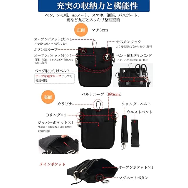 ■【3WAYスタイル】ウエスト用と斜め掛け用の2種類のベルト、カラビナ付きで、カラビナポーチ、ベルトポーチ、ショルダーポーチ等お好みのスタイルで使えます。またカラビナでリュックに掛けたり、バッグ取り付けベルトでトートバッグに掛けたりも可能。ウエストベルトは120cm、ショルダーベルトは150cmまで調整可能。■【作業効率UP!】蓋がないから出し入れしやすく、作業時に使いやすい!作業着や白衣など大きめの腰ポケットがある場合、中に入れてポケット内の整理にも役立ちます。■【多数の便利機能】フロントにはナイロン生地のペン差し付き。キーホルダーや鍵をつけられるDカン、ボタン式ループ、ナスカンフック、カラビナも付属。フロントポケット内部にも落下防止ゴムバンドを装備。バッグ取り付けベルトは、テープを通すループとしても使用可能。付属のウエストベルトを使えばポーチの位置を自由にスライド可能など機能が満載。