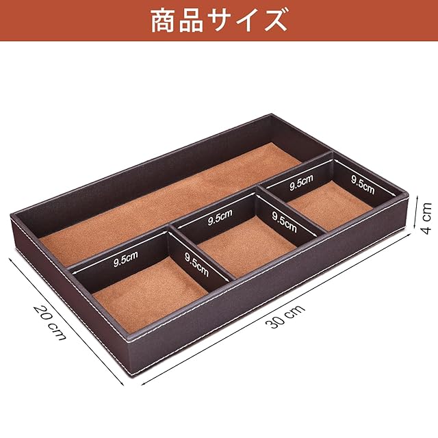 「商品サイズ」本体:30cm×20cm×4cm、A4サイズ相当の大きさに、内径29.5x9.5cmの仕切りが1つと9.5x9.5cmの正方形の仕切りが3つの構成、トレーの深さは3.5cmです。異なる収納仕切りが4つあり、家の中の目立たない小物を一か所にまとめて、探すストレスを解消、デスクの周りもスッキリ!