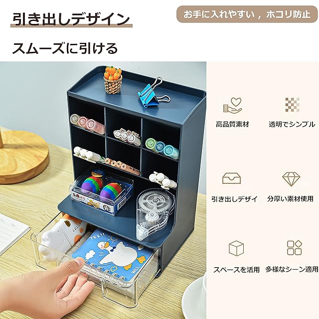 【多機能収納】傾斜した上段には文房具やハサミ、メイクブラシなど細長いものを、下段の引き出しにはキーテープなど紛失しやすい小物を収納することが可能です。また、傾斜のある仕切りは、不要な時は取り外して収納することができます。