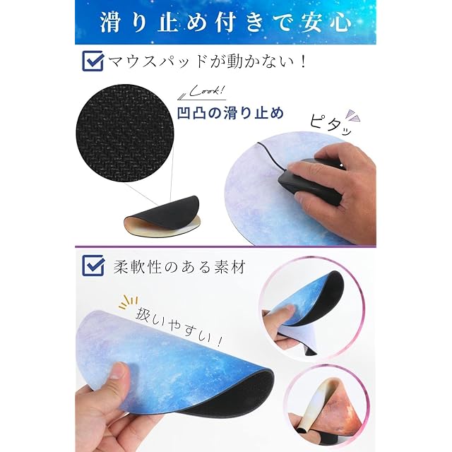 【 滑り止めが付いていて安心 】 本製品の裏面は凹凸の滑り止めがついているので、マウスを動かしたときにマウスパッドが動いたりせずに快適にご使用頂けます。また、柔らかい柔軟性のある素材で扱いやすいのも特徴です◎