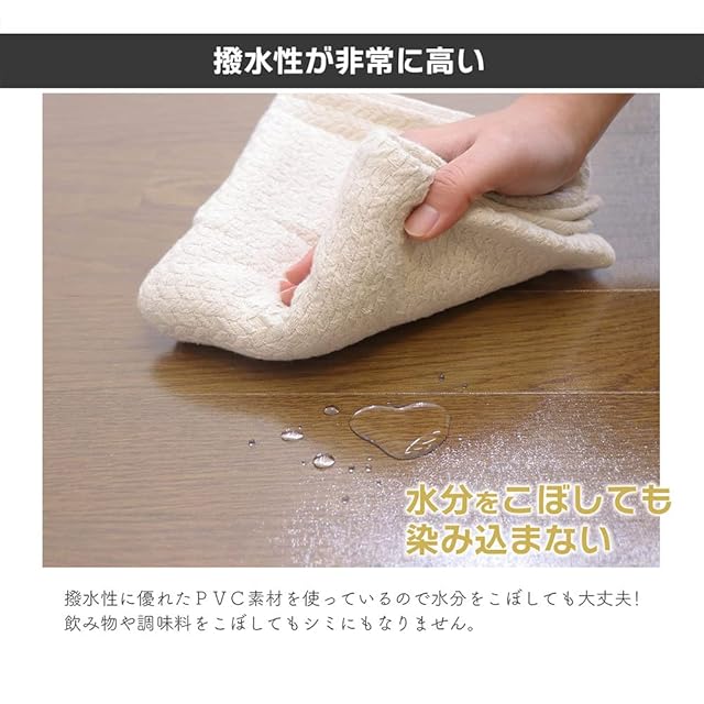 【機能性抜群】■抗菌・抗カビ機能付きで、ご家庭でのご使用も安心安全■撥水性に優れたPVC素材を使っており、水分をこぼしても染み込まず接地面を保護。 飲み物や調味料をこぼしても、シミにもなりません。清潔さを保って衛生的にご使用いただけます。■ハサミでカットしやすいのでお好みのサイズにカットして使える!