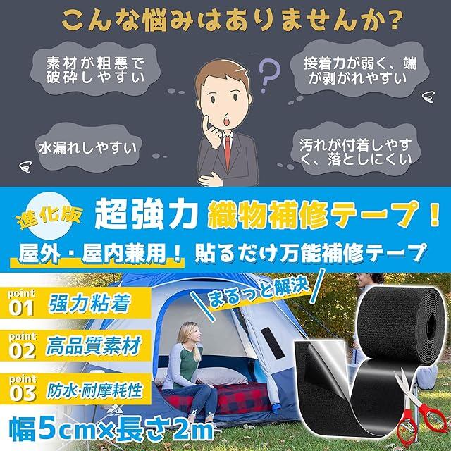 【屋外・屋内両用】屋外でも屋内でも使える万能補修テープ!テント・タープの補修はもちろん、カーテンやソファの屋内補修にも最適。耐水・耐熱性に優れ、夏の暑さや冬の寒さにも対応。車の幌から家庭用家具まで、一年中使える高耐久設計です