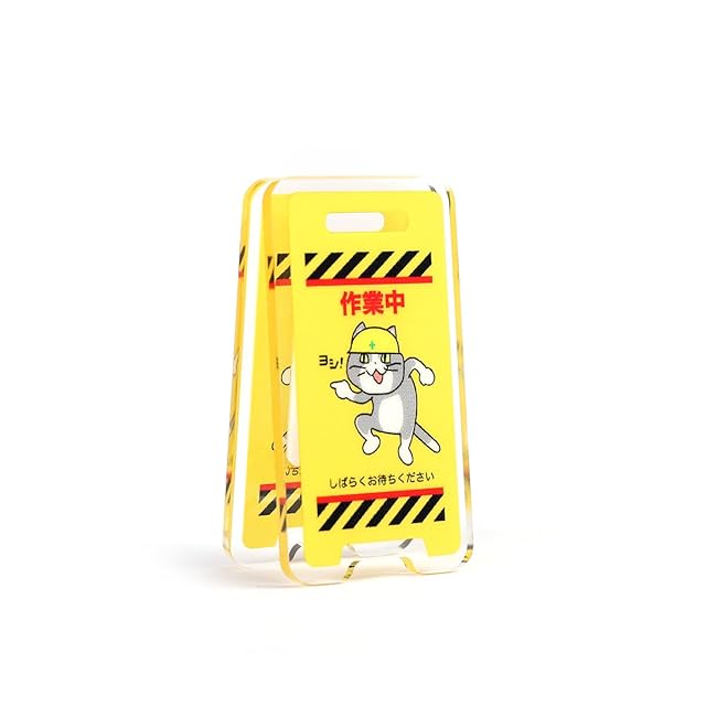 デザイン: 可愛い作業中の猫のイラストが特徴的な黄色い警告スタンド型クリップです