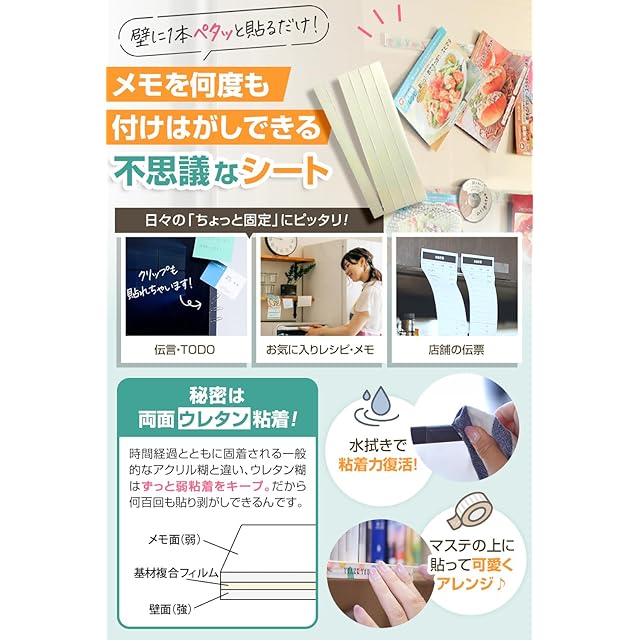 メモやメニュー表等、紙やカードを何度も貼ったりはがしたりできるシートを使った便利な粘着シート付きスタンドです。