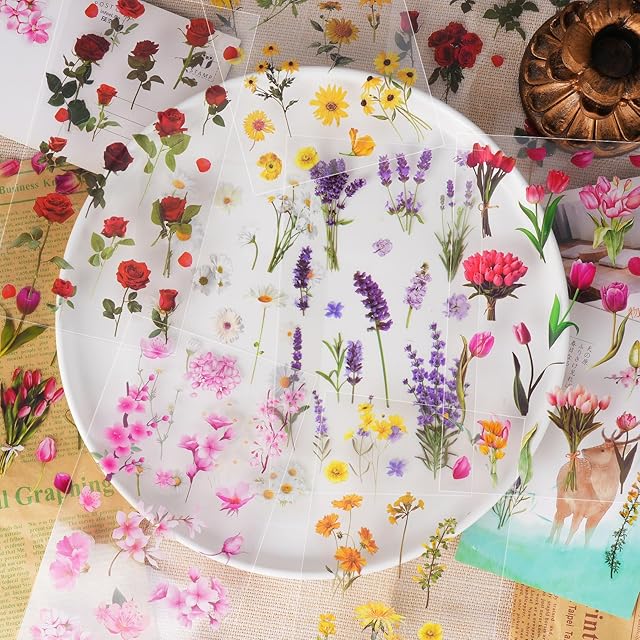 ANZOBEN シール コラージュ 素材 花 大容量約666枚 詰め合わせ ステッカー フレークシール PET 半透明 桜 ひまわり 可愛い 手帳シール セット 防水シール ins風(四季の花)