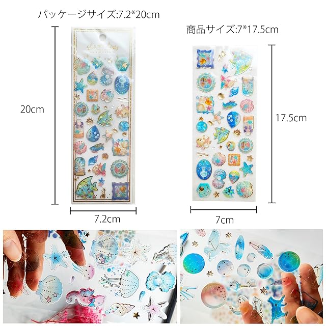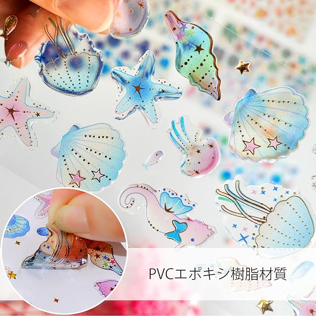 【デコシール10枚セット】:かわいい貝殻から魚、ユニコーン、月、星、イルカ、ドリフトボトル、うちわ、サンゴ、クラゲ、タツノオトシゴ、桜、宇宙まで幅広く入っています。 <br><br>【可愛い立体シール】: ❶クリアベースのエポキシクリスタルステッカーです。接着力が強く、防水性、耐久性に優れています。❷表面の図案は箔押し工芸を采用し、はっきりしていて、金属のような質感を現しています。 <br><br>【使いやすい】:裏面の粘着剤があり、はがして直接貼り付けます。手帳シールをノートに貼って、自分だけの手帳や日記等をカスタマイズで作り上げることができます! <br><br>【幅広い用途】:❶かわいい立体シールで、グリーティングカード、しおり、紙の手紙、手帳、カレンダー、スマホ、メッセージノート、学校のプロジェクトなどを自分のスタイルで作ることができます。❷子供にプレゼントやご褒美シール。かわいい シールに子達がすごく喜ぶとおもいます。 <br><br>【仕様】:素材:樹脂、パッケージ:ステッカー10枚、サイズ:72 x 200mm <br><br><br>●白いプラスチック段ボールのスタイルはランダムにされます。