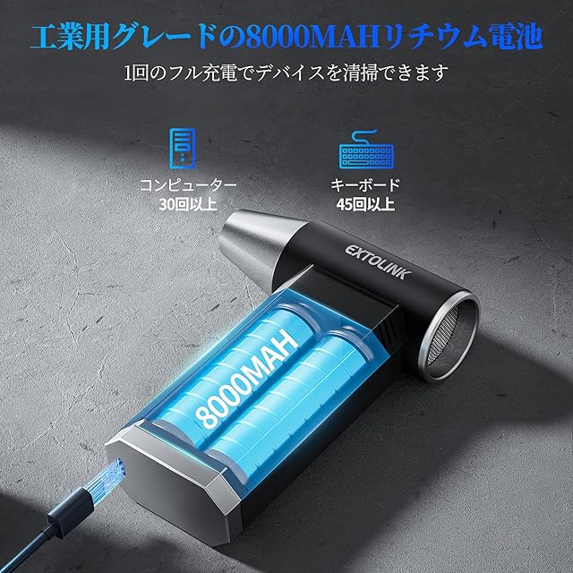 【8000mAhの長持ちバッテリー】最弱モードで最大110分間連続使用可能。フル充電もわずか2.5時間で完了。過充電・過放電保護機能付きで安全です。エアダスター 充電式ならではの便利さ!