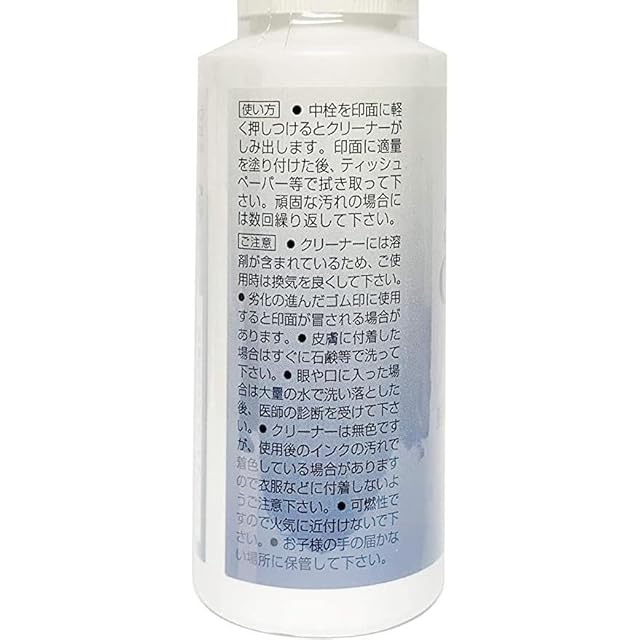 中栓を印面に軽く押しつけるとクリーナーがしみ出します。印面に適量を塗り付けた後、ティッシュペーパー等で拭き取って下さい。頑固な汚れの場合には数回繰り返して下さい。