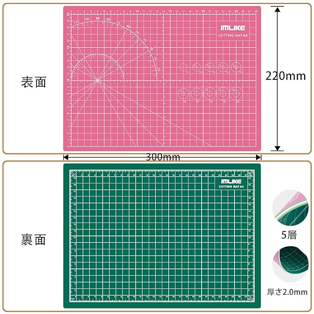 <p> A4サイズで使いやすい、オフィスでもご家庭でも愛用されているIMLIKEカッティングマット。こちらは300mm×220mmのA4サイズ。厚さはたった2mmですが、傷がつきにくく快適な使い心地。秘密は5重構造のマット。オレフィン系の硬質シートを軟質シートで挟んで、両面どちらでも使える仕様になっています。ガイドラインにそった正確なカッティングにはできます。</p> <p><br></p> <p>A4用紙が収まるサイズ。使いやすく収納にも便利。A4のチラシより小さな申し込み票やクーポンのカット。また、下敷きのように雑誌のページの間に挟んだカットなど、小回りが利きます。カッターの傷からにも保護できます。</p> <p><br></p> <p>IMLIKEのカッティングマットの表面には、分度器いらずでカット可能 1cm方眼、円ライン、角度線など図形ガイドが付いているので, 誰でも簡単にカット作業をすることができます。</p> <p><br></p> <p>IMLIKEのカッティングマットは、機能性だけではありません。鮮明な色味・グリーン/ピンクが両面カラーで作業中に目が疲れにくいのです、目に見て明るい気持ちがしています。お子様にも安心してお使いいただけます。工作、学習プリントの切り貼り、新聞の切り抜き、手芸での布や素材シートのカットなど、用途は幅広いです。</p>